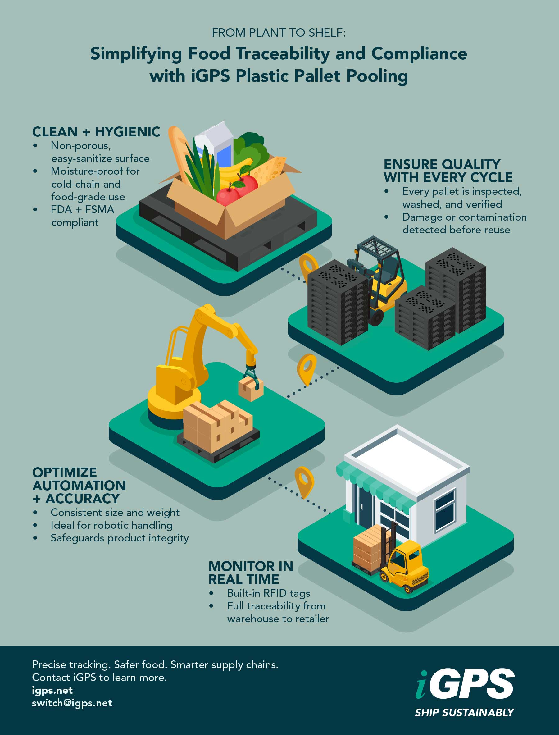 Food safety and transparency begin with precise tracking. iGPS RFID-enabled plastic pallets deliver pallet-level visibility while providing a clean, consistent, and compliant foundation for every shipment. To learn how iGPS can strengthen your traceability and compliance systems, call 1-800-884-0225, email switch@igps.net, or visit our contact page.